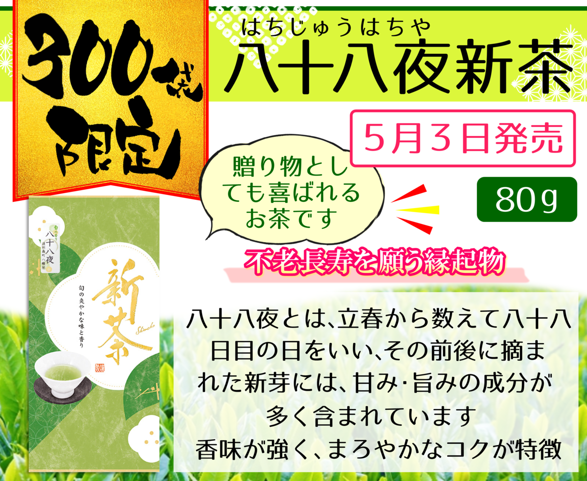 新茶 煎茶 八十八夜新茶 80g 販売価格 1,684円(税込み) 会員価格 (税込み) 通常価格 (税込み) 在庫 商品コード s4038 JANコード 数量 - + カートに入れる カテゴリー 新茶 煎茶 ツイートする シェアする 〒437-0216 静岡県周智郡森町天宮1177店舗営業時間 月~土曜 8:00 - 17:00◆定休日:日祝休み 2026年03月 日 月 火 水 木 金 土 1 2 3 4 5 6 7 8 9 10 11 12 13 14 15 16 17 18 19 20 21 22 23 24 25 26 27 28 29 30 31 2026年04月 日 月 火 水 木 金 土 1 2 3 4 5 6 7 8 9 10 11 12 13 14 15 16 17 18 19 20 21 22 23 24 25 26 27 28 29 30 定休日 ショッピングガイド 特定商取引法に基づく表記 個人情報保護方針 送料について 会員規約 お問合せ